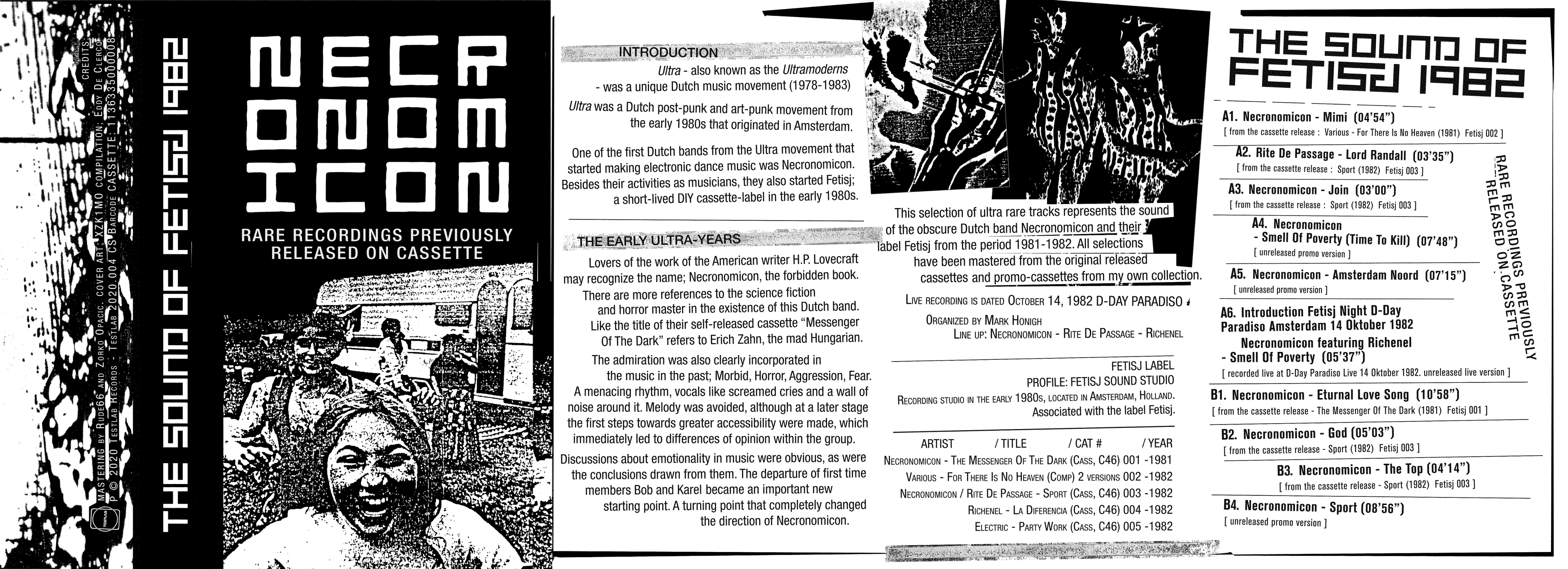 This selection of ultra rare tracks represents the sound of the post-punk Dutch band Necronomicon and their label Fetisj from the period 1981-1982. All selections have been mastered from the original released cassettes and demo-cassettes from the collection of Eddy De Clercq